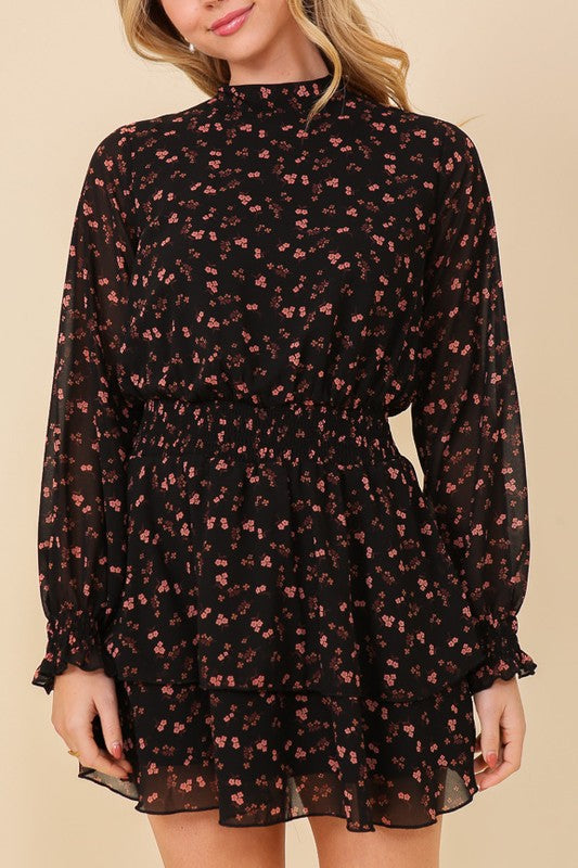 Fall in love with the effortless romance of our Midnight Bloom Mini Dress! This gorgeous piece is the perfect blend of sweet and sophisticated, designed to be your go-to for any occasion. It features a chic high mock neck and stunning semi-sheer blouson sleeves that end in a delicate ruffled cuff.