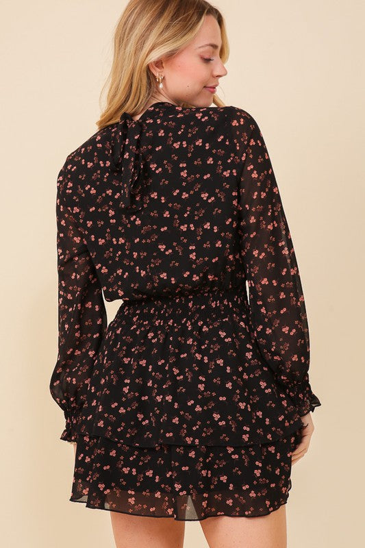 The comfortable and flattering smocked waistband defines your figure before flowing into a playful, tiered ruffle skirt that moves beautifully with every step. The timeless black base with a ditsy pink floral print makes it perfect for transitioning through the seasons.