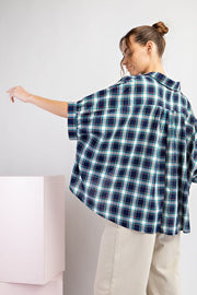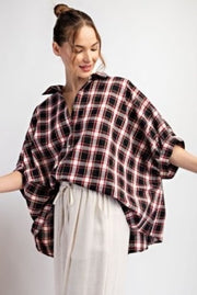 Plaid short sleeve top featuring a button down front, a collared neckline, short dolman sleeves, pinching in the back and is a boxy silhouette.