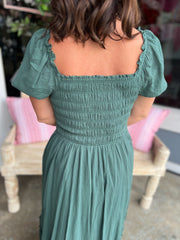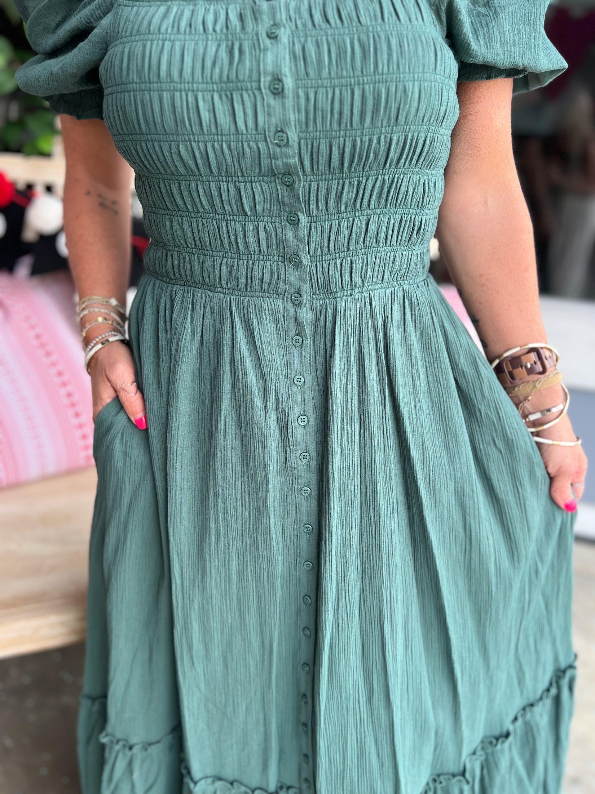 SMOCKED BUTTON DOWN MAXI DRESS FEATURING: - COTTON GAUZEY FABRICATION - SMOCKED BODICE FRONT AND BACK - FUNCTIONAL BUTTON DOWN DESIGN - ELASTIC SLEEVE ENDS - SIDE POCKETS - RUFFLED EDGE FLOUNCE - FULL LINING