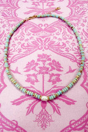 1 layer necklace featuring alternating stone beads and gold beads, with one larger pearl bead. Lobster claw closure + 2 inch extender Length: Approx. 9" from top to bottom of chain when closed Length Unclasped stretched out flat: Approx. 18" including extender