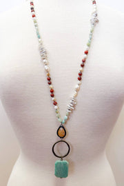 Long chain necklace with sections of intermittent beading. Includes a beautiful polished stone pendant attached by a jump ring.