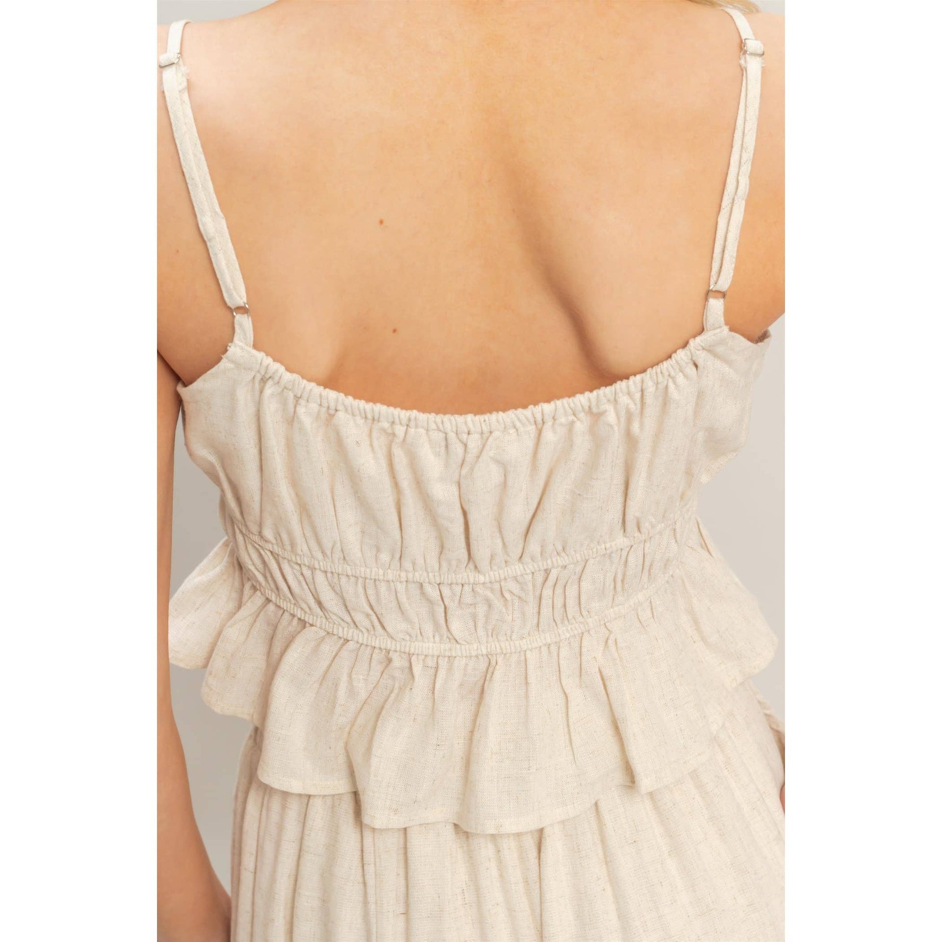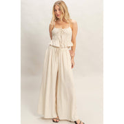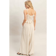 This two-piece set features a tiered, spaghetti strap tank and flowing palazzo pants with a drawstring waist. Pair it with strappy sandals for an easy summer ensemble.
