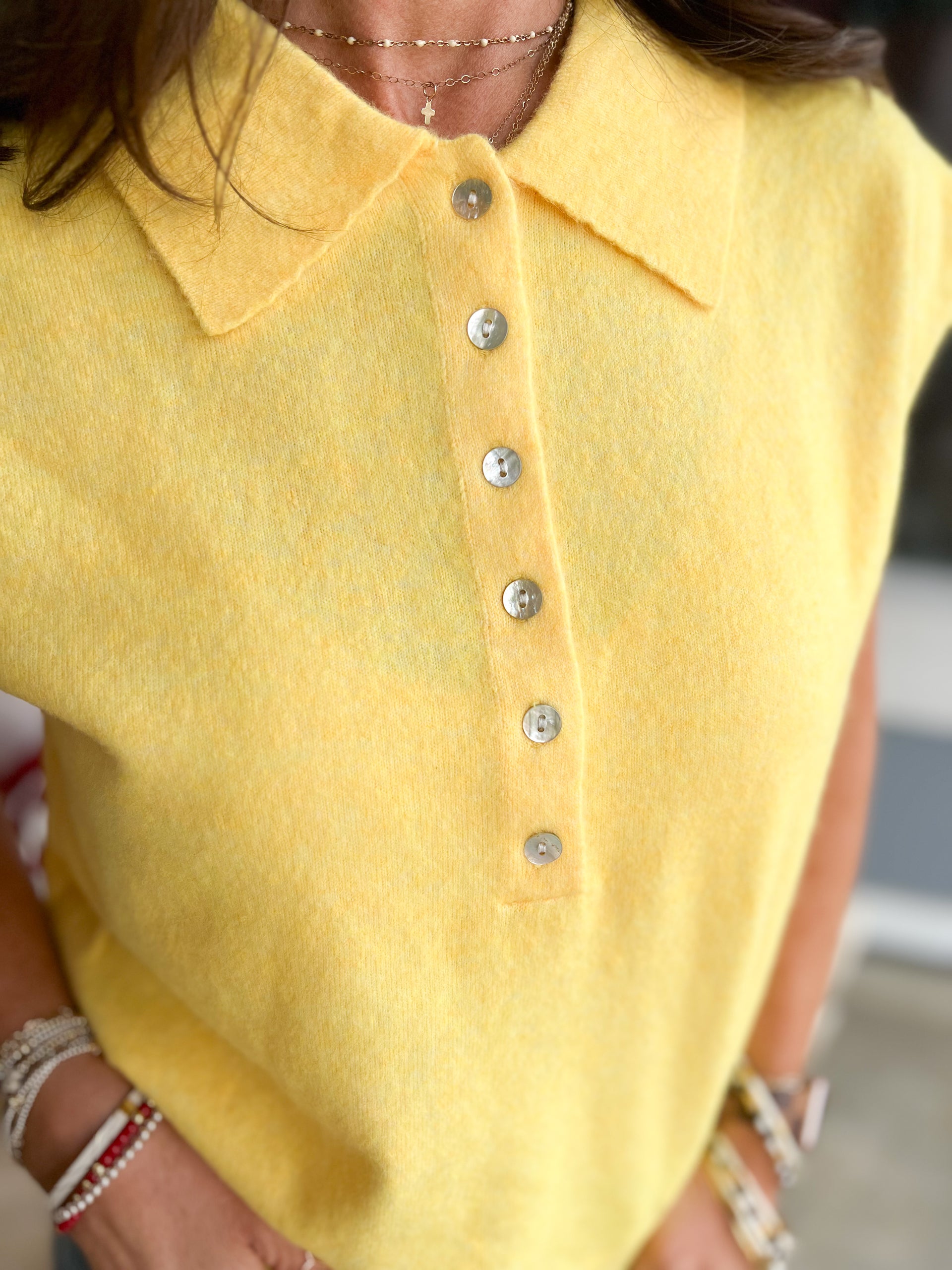 + Cap sleeve sweater vest + Button down placket + Collared neckline + Cap sleeve + Relaxed bodice