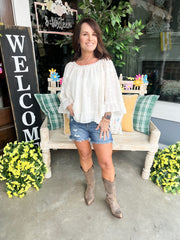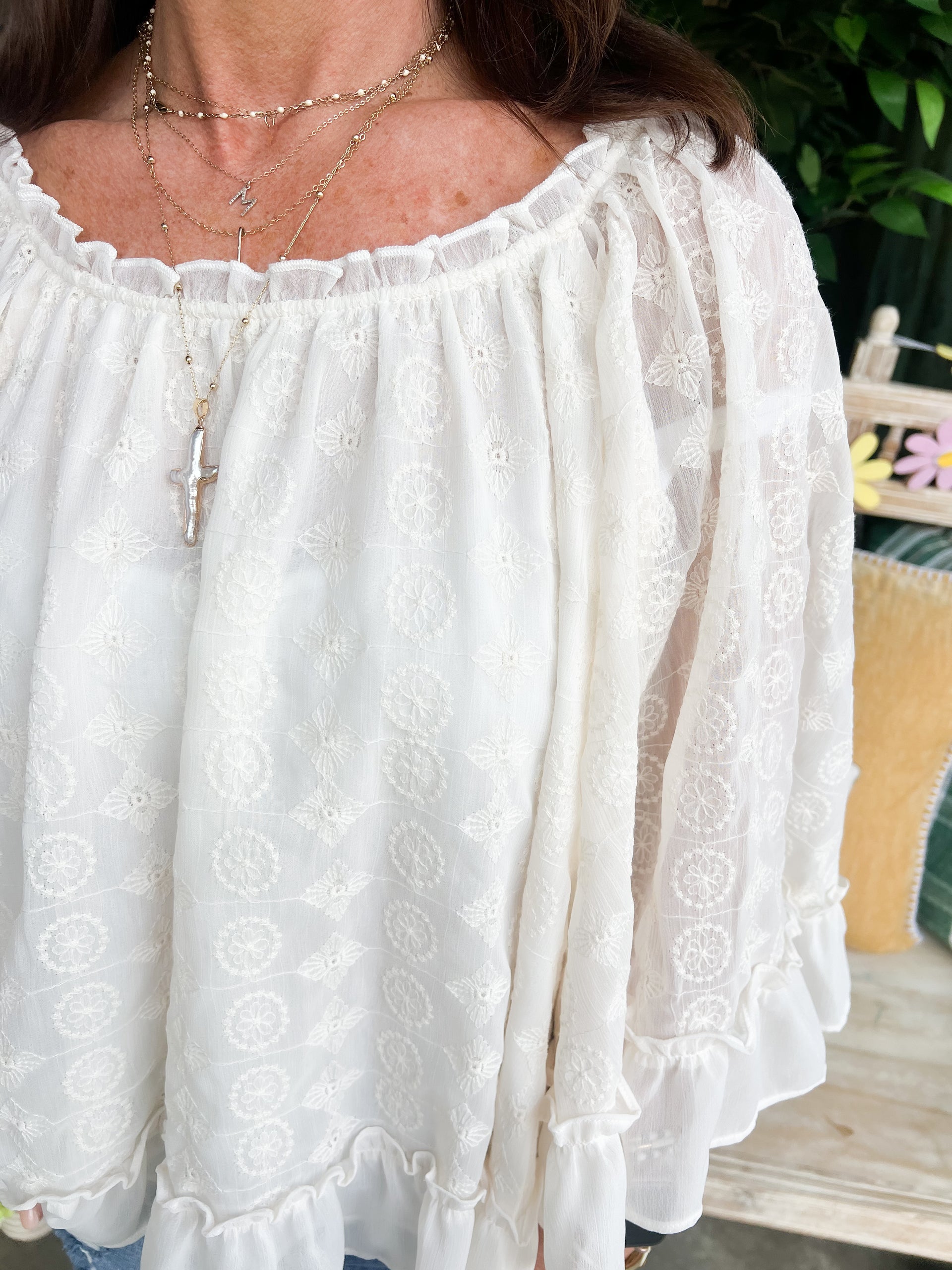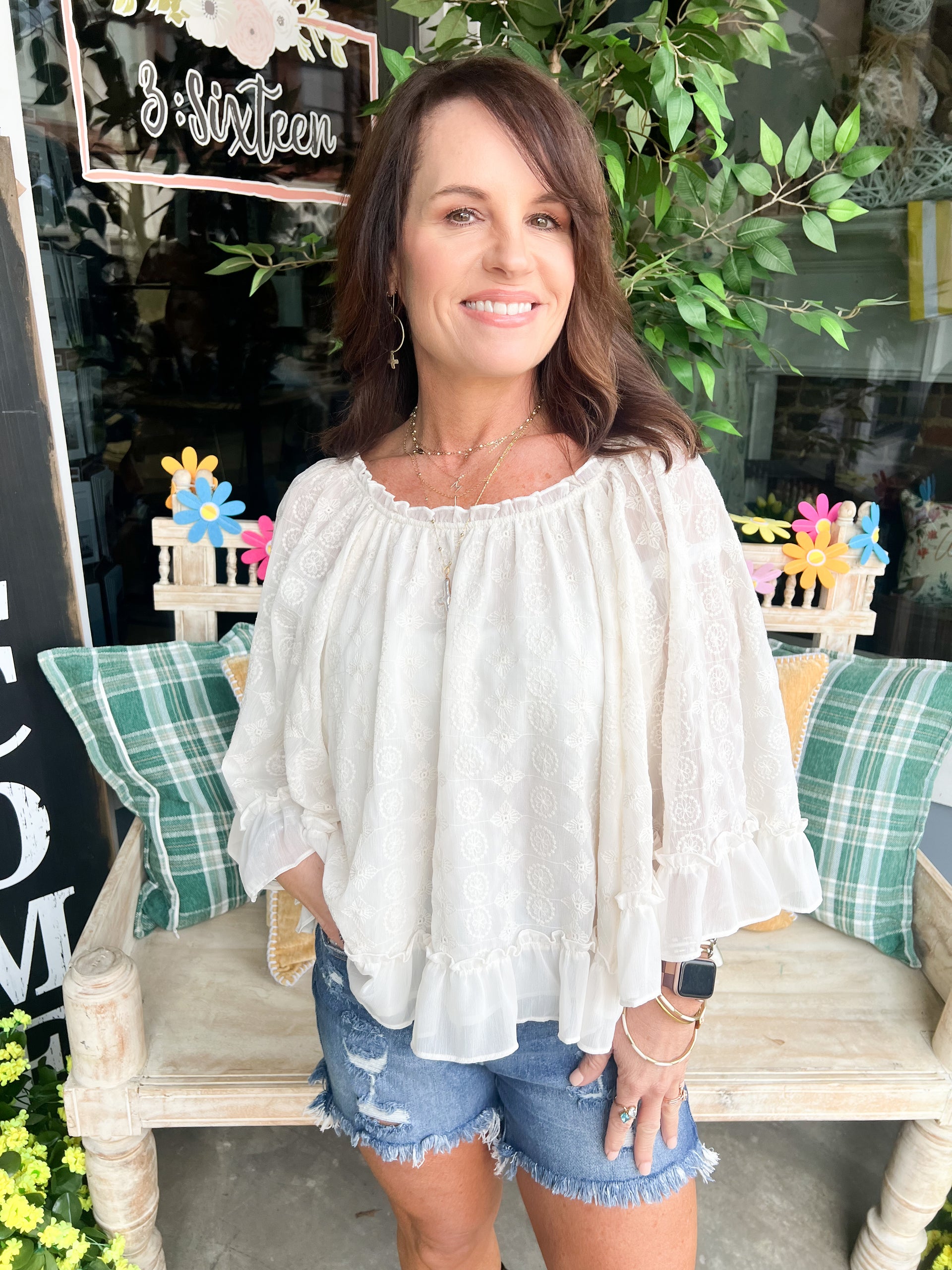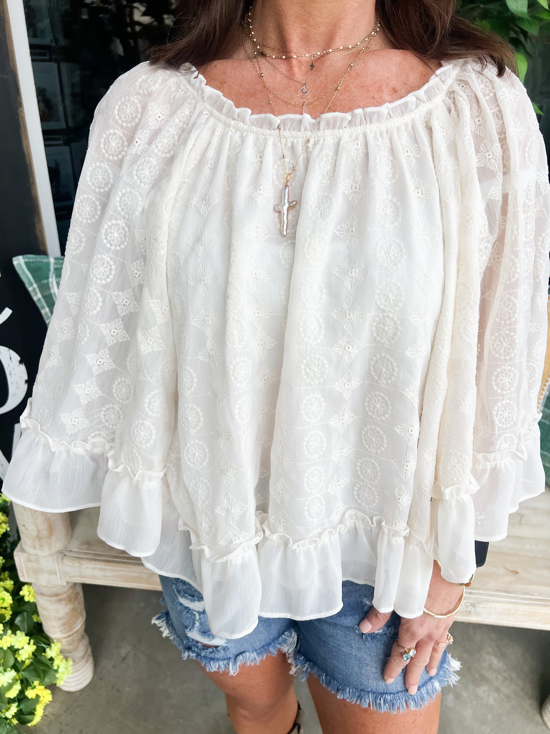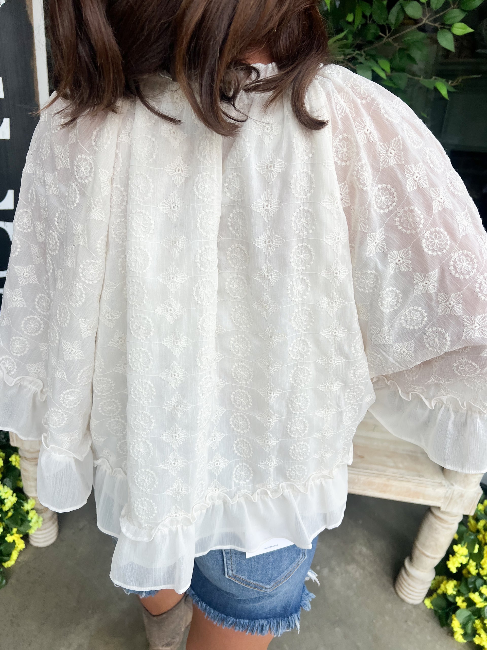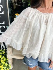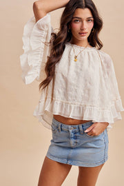 ROMANTIC CAPE TOP FEATURING EMBROIDERED CHIFFON FABRICATION, CONTRASTING RUFFLED HEM, RUFFLED NECKLINE WITH BACK BUTTON KEYHOLE, AND FULL LINING