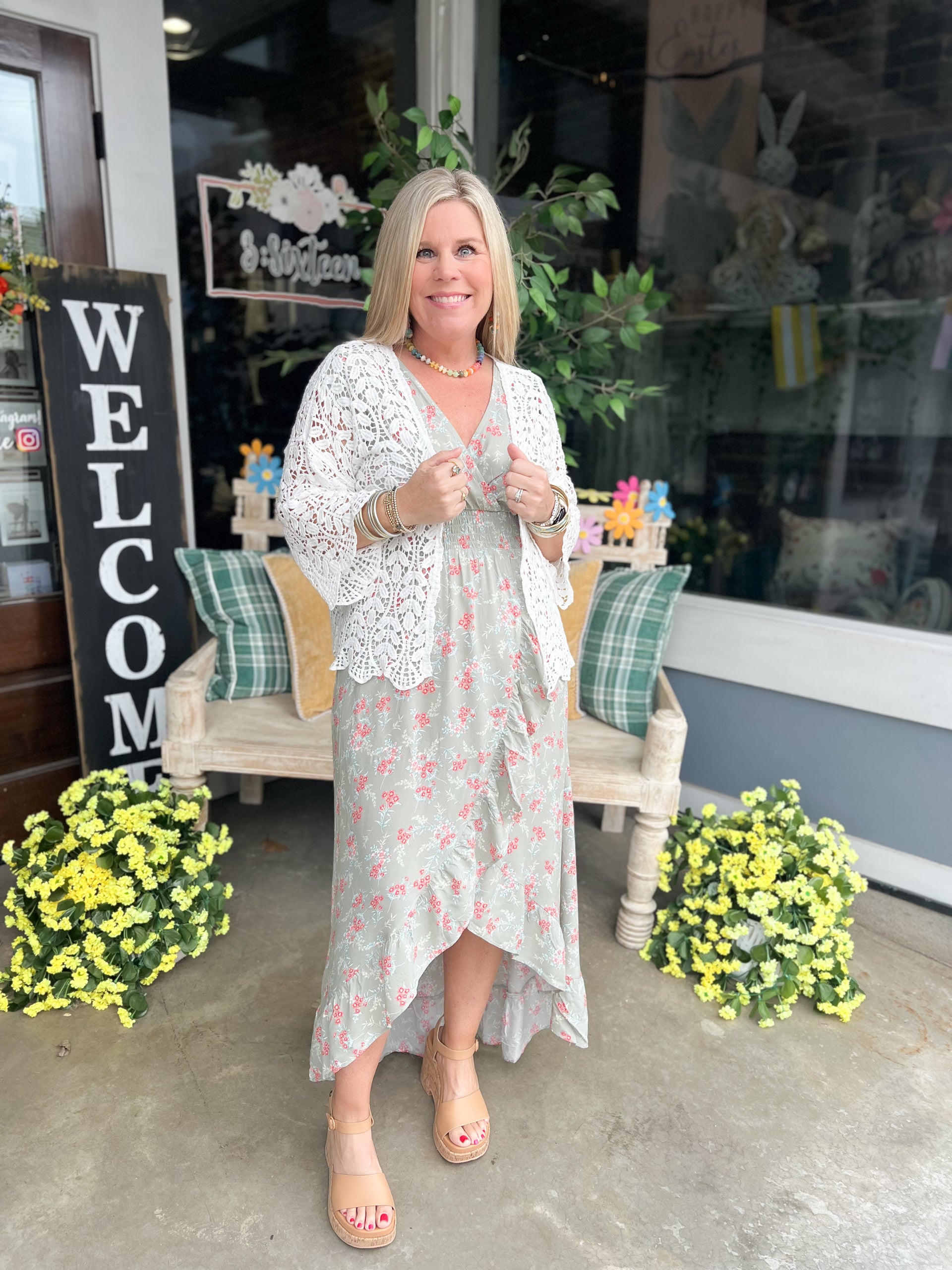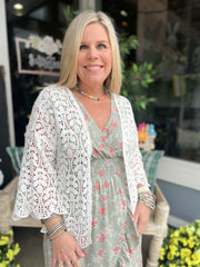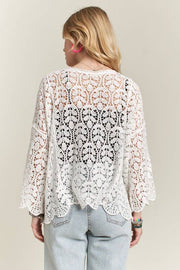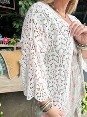 This is an elegant, open-front crochet cardigan featuring an all-over floral lace pattern and voluminous wide sleeves. The lightweight design boasts a relaxed, draped silhouette with scalloped edges, making it a perfect bohemian layer for a summer camisole and denim look. 100% COTTON *Drop shoulder *Crochet *Leaf pattern *Open front *Scallop edge Actual product color may vary from the images shown.