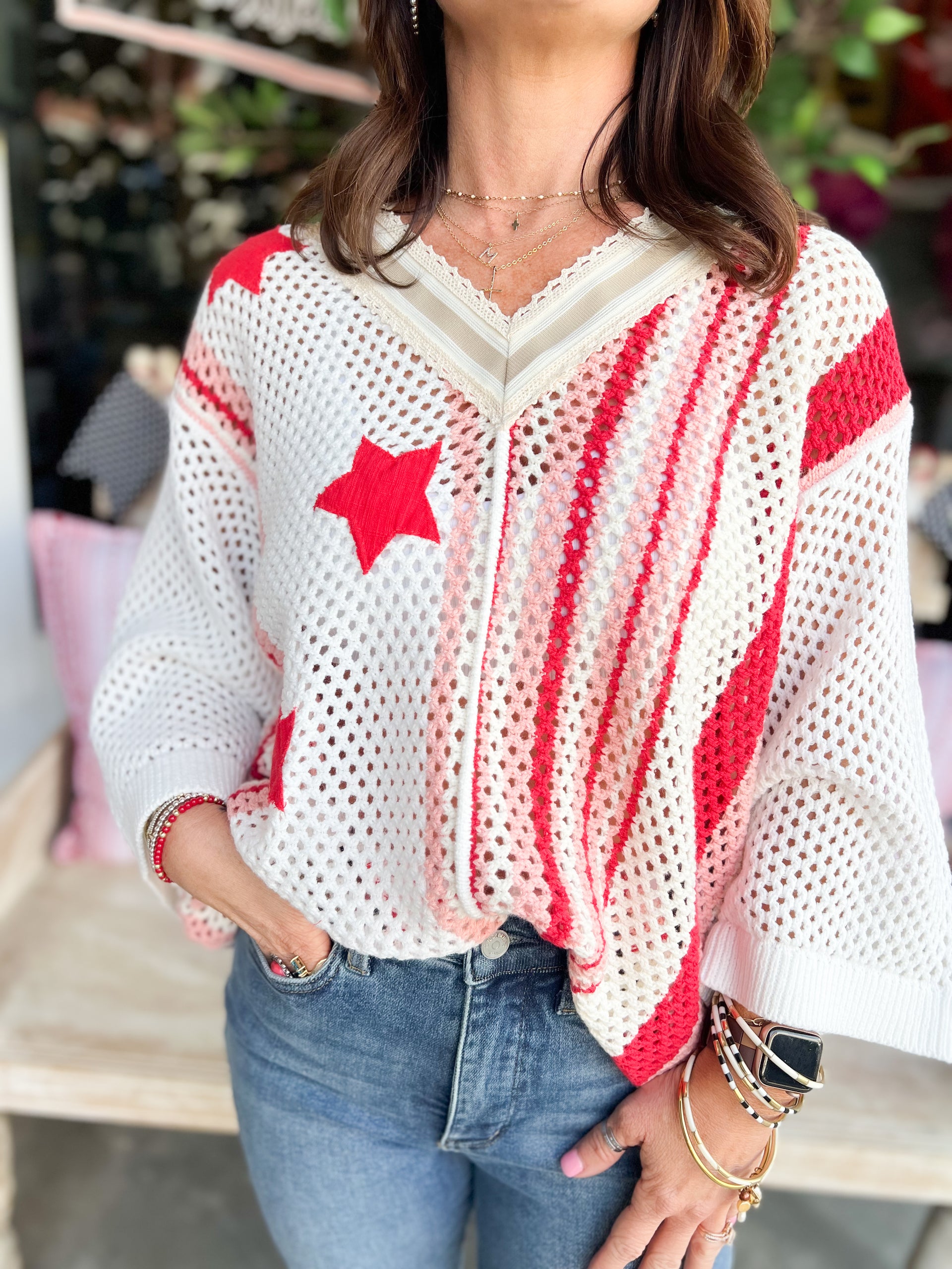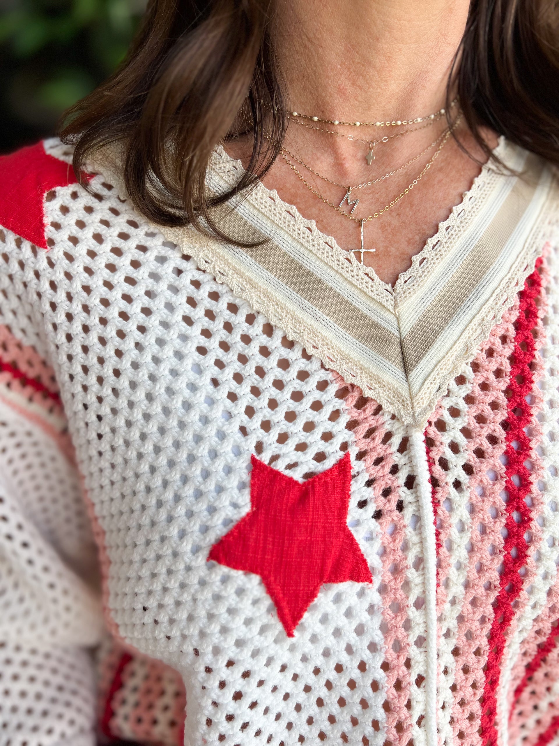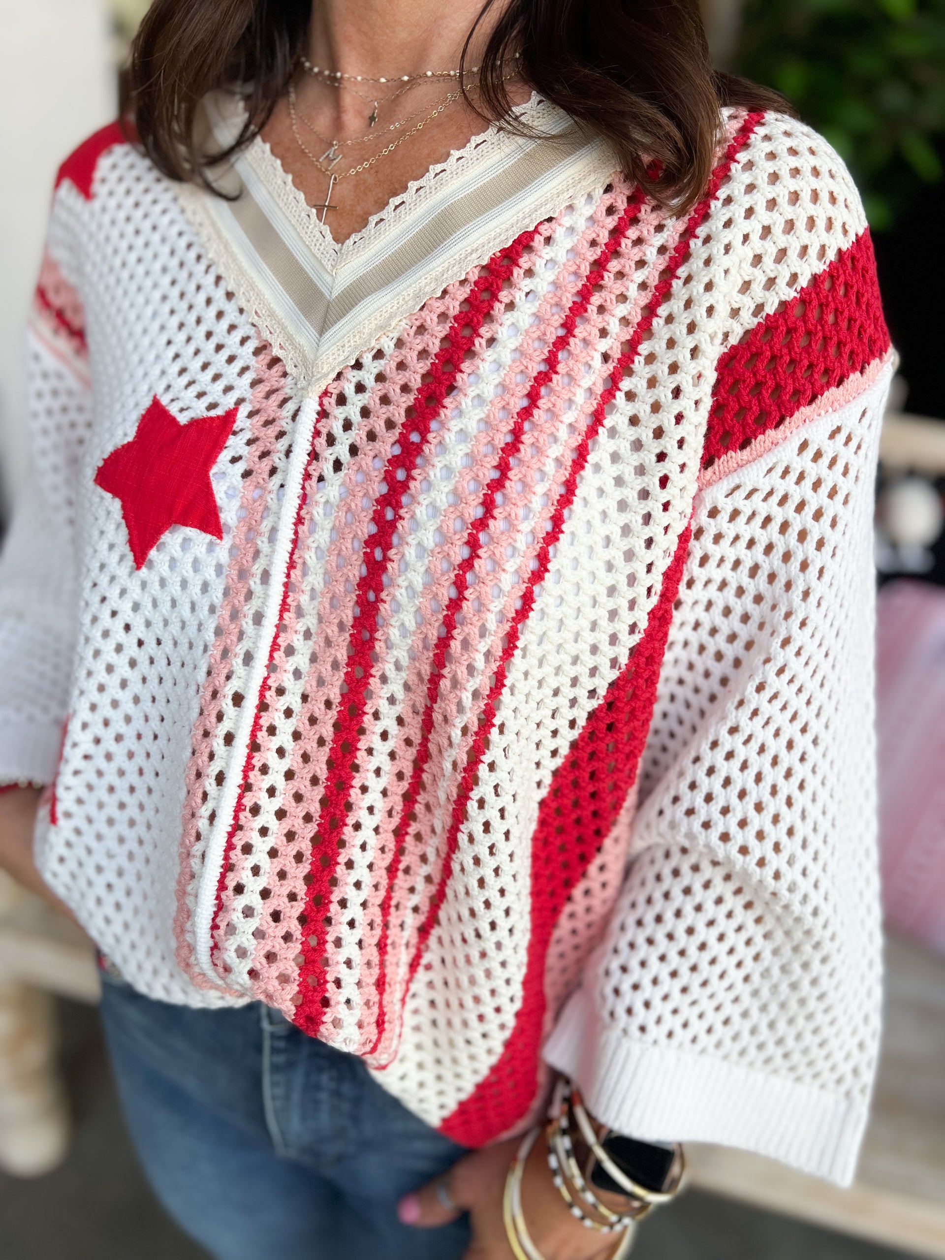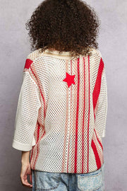 V-Neck Half Sleeve Stripe Sweater Top Star Patch Band Trim