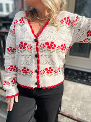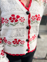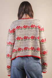 - Floral Graphic Detail Knit Sweater Cardigan - Button Down - Scallop Edge - Long Sleeve