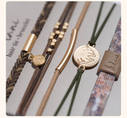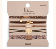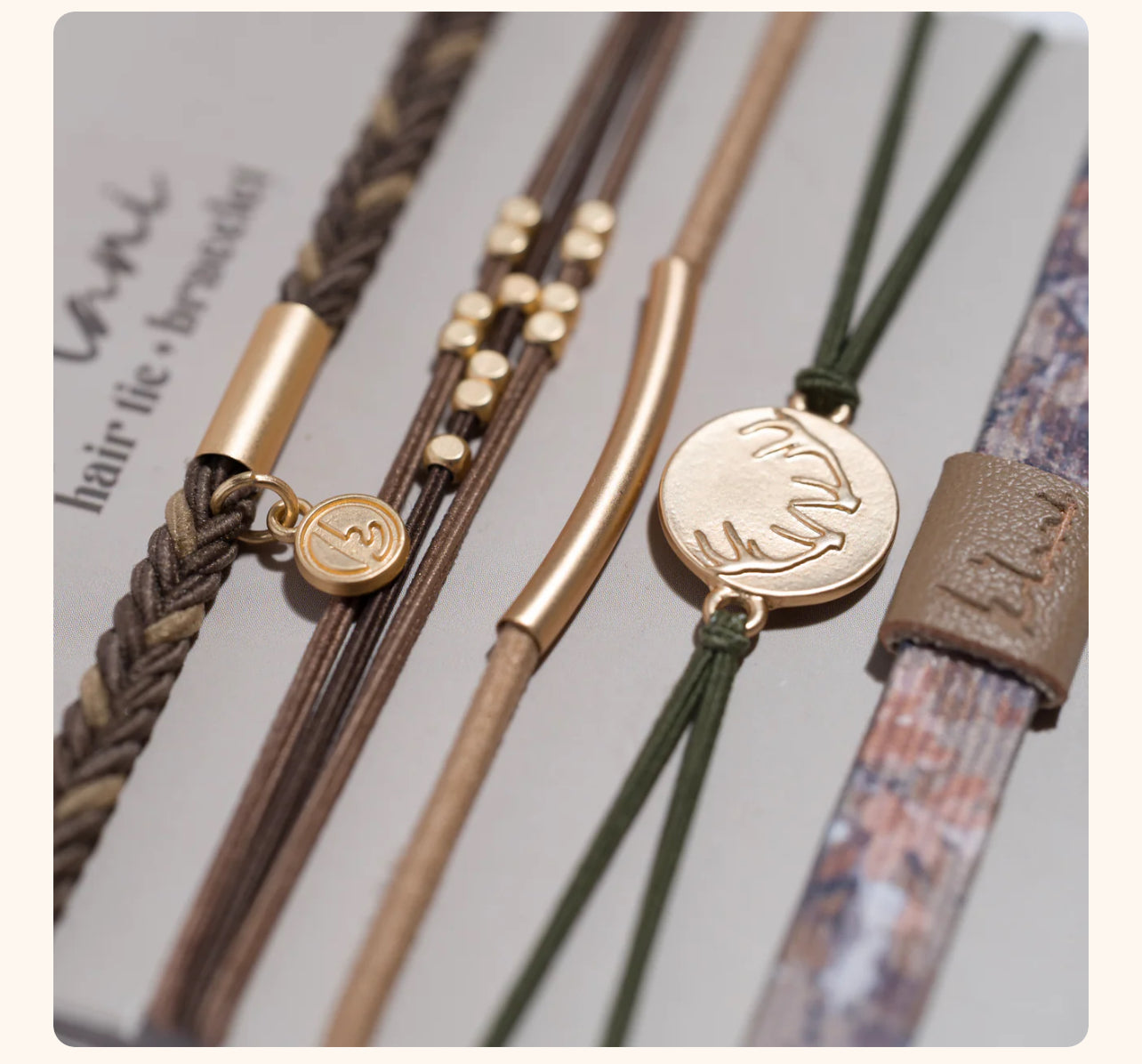 The Adapt set comes with 5 hair tie bracelets in earthy neutral tones, including one band with a bold trendy camouflage pattern.  This set is accented with gold charms and antler details. Adapt set is all about strength and resilience- A reminder to stay grounded, flexible, and ready for whatever comes your way.