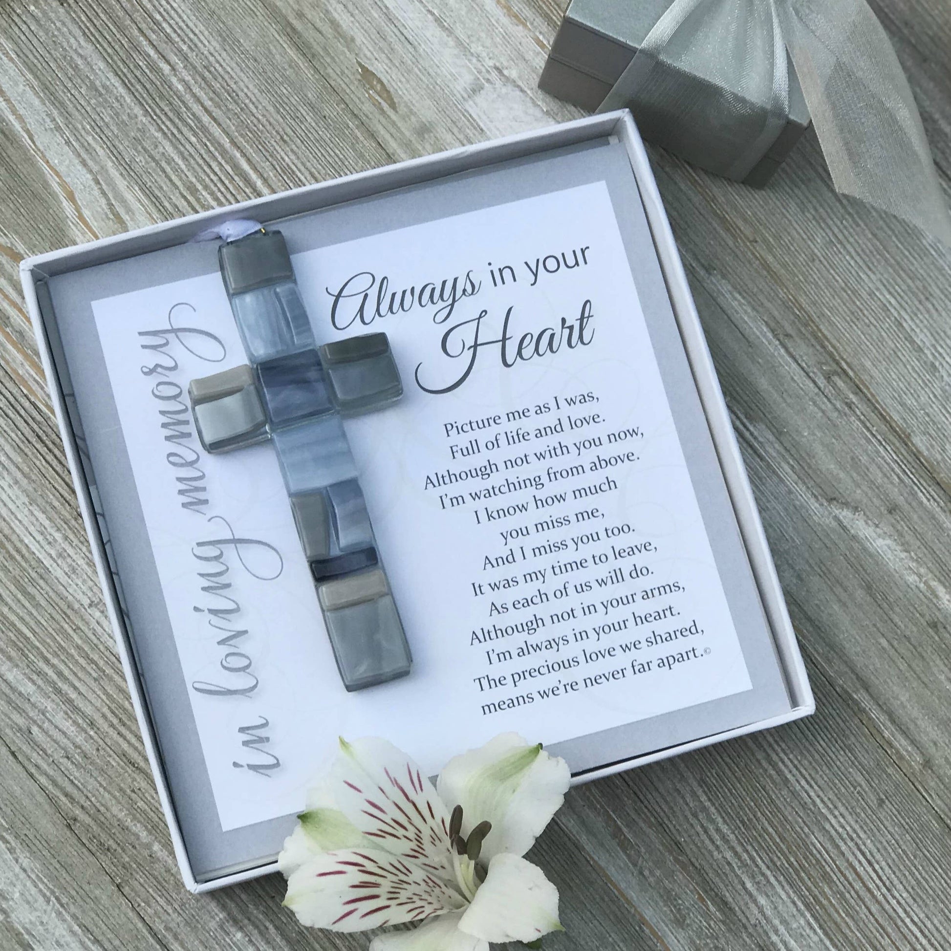 The cross and sentiment card come gift boxed in a white 5.5x5.5 box with a clear lid, ready to give or send to a loved one suffering a loss. A thoughtful and appreciated gift for a friend, family member, co-worker, or neighbor.