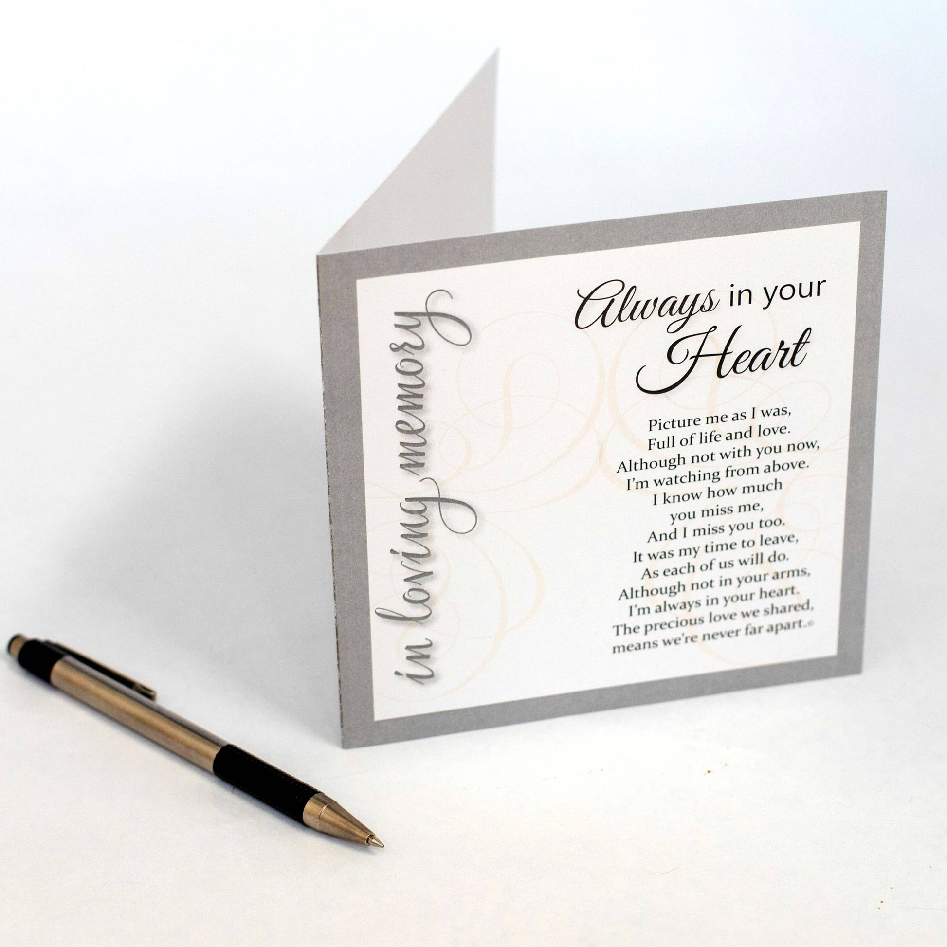 Beautiful handmade in USA glass mosaic cross with heartfelt "Always In Your Heart" remembrance sentiment printed on a high-quality folded card with space to write your message of sympathy and condolence.