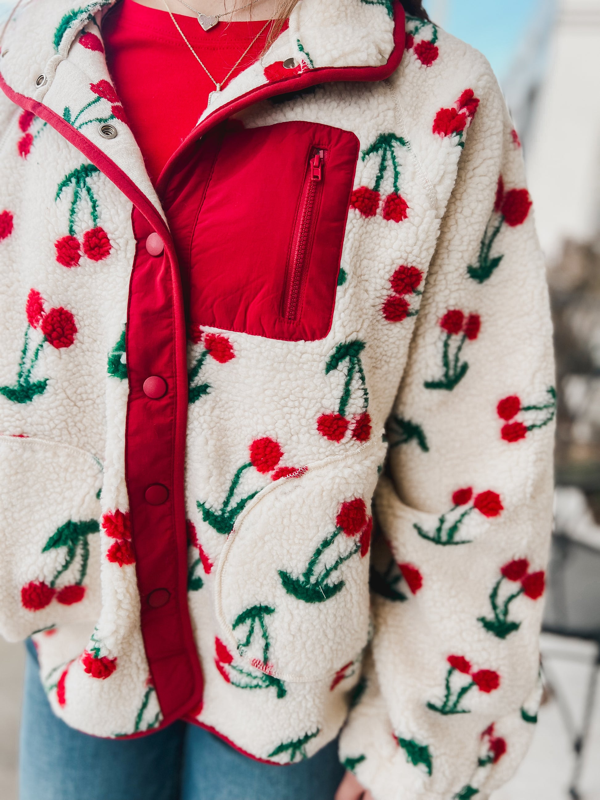 Overszied cherry Printed Casual Fleece Jacket - High Neck - Front Zip UP - Long Sleeve - Drop Shoulder - Side Pockets