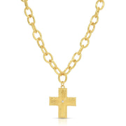 The substantial cross pendant hangs gracefully from a chic oval chain, known for its contemporary appeal and comfortable wear. This combination of the modern chain and meaningful contemporary cross creates a necklace that's both a testament to faith and a fashion-forward accessory.