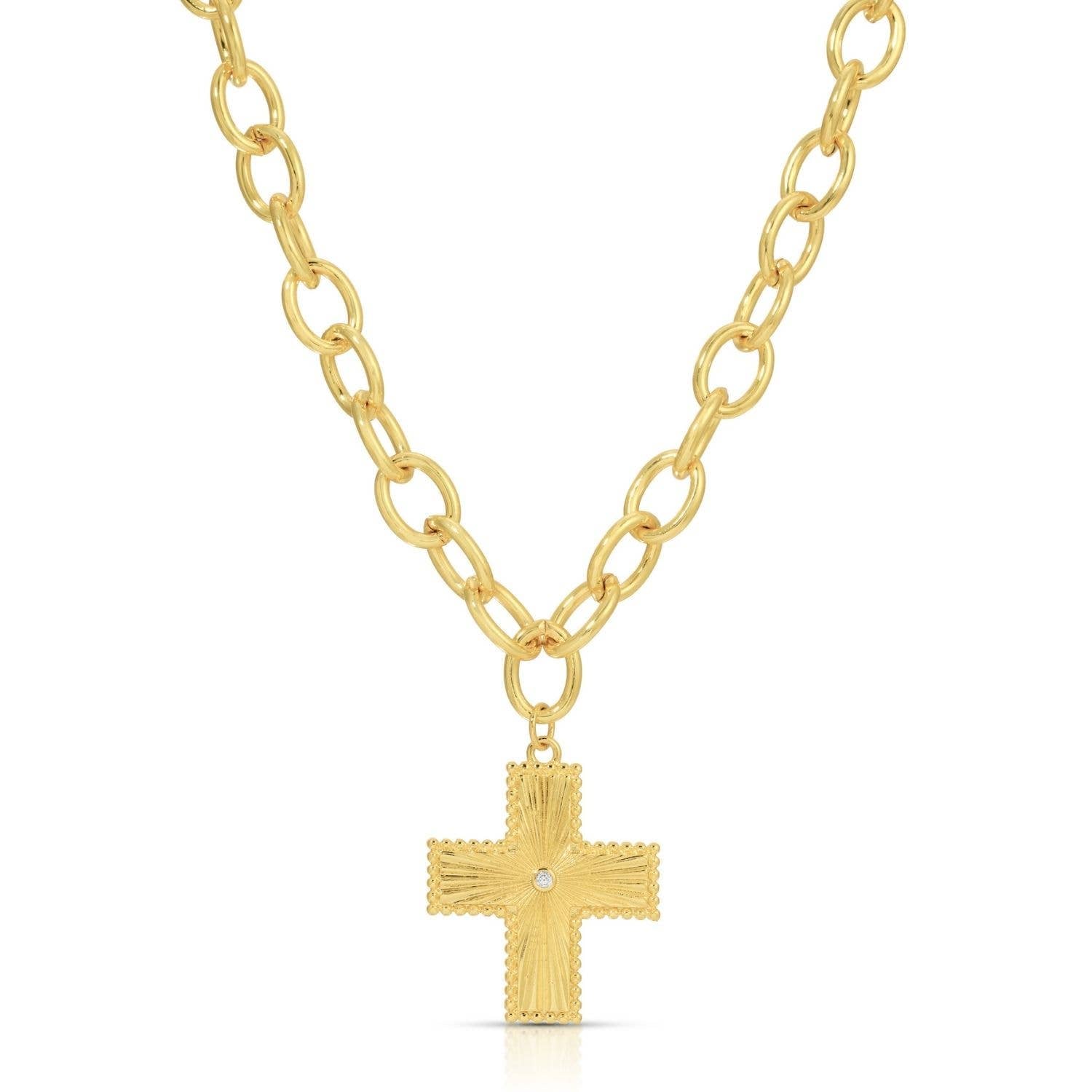 The centerpiece of this striking necklace is the bold cross pendant, featuring an intricate burst design lavishly adorned with a cubic zirconia (CZ) stones. This sparkling faux diamond adds the perfect touch of sparkle.
