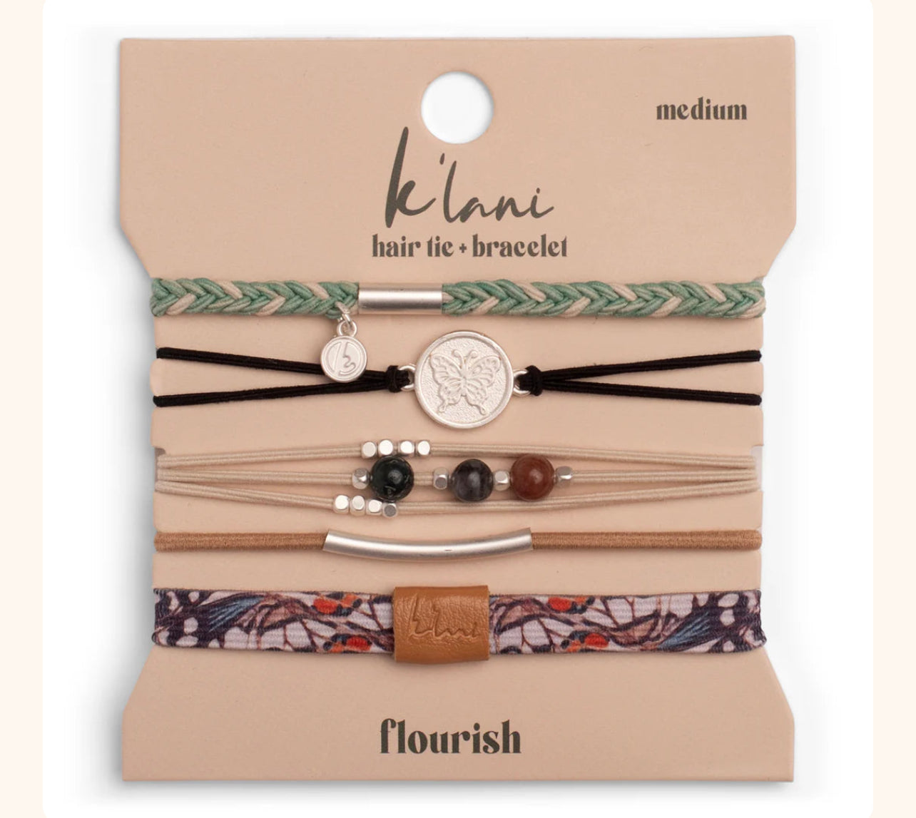 Our Flourish set is a tribute to growth, transformation, and natural beauty. These 5 hair tie bracelets future a graceful blend of teal, black, and tan tones, accented with natural stone beads and a vibrant butterfly wing pattern. The delicate butterfly charm symbolizes change and confidence, reminding you to embrace your journey and flourish in your own unique way.