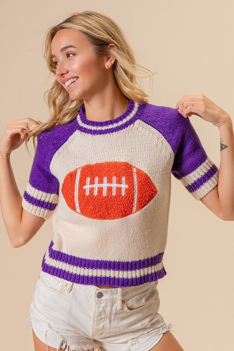 football pattern striped rib band short raglan sleeve sweater