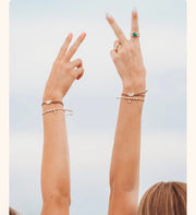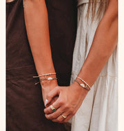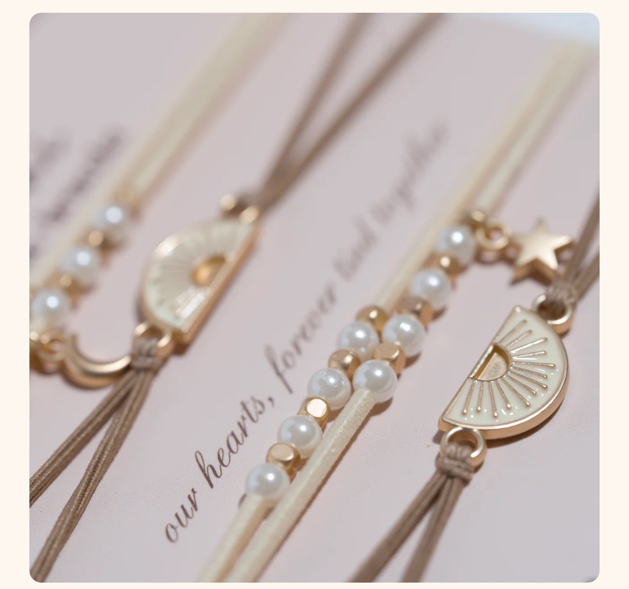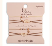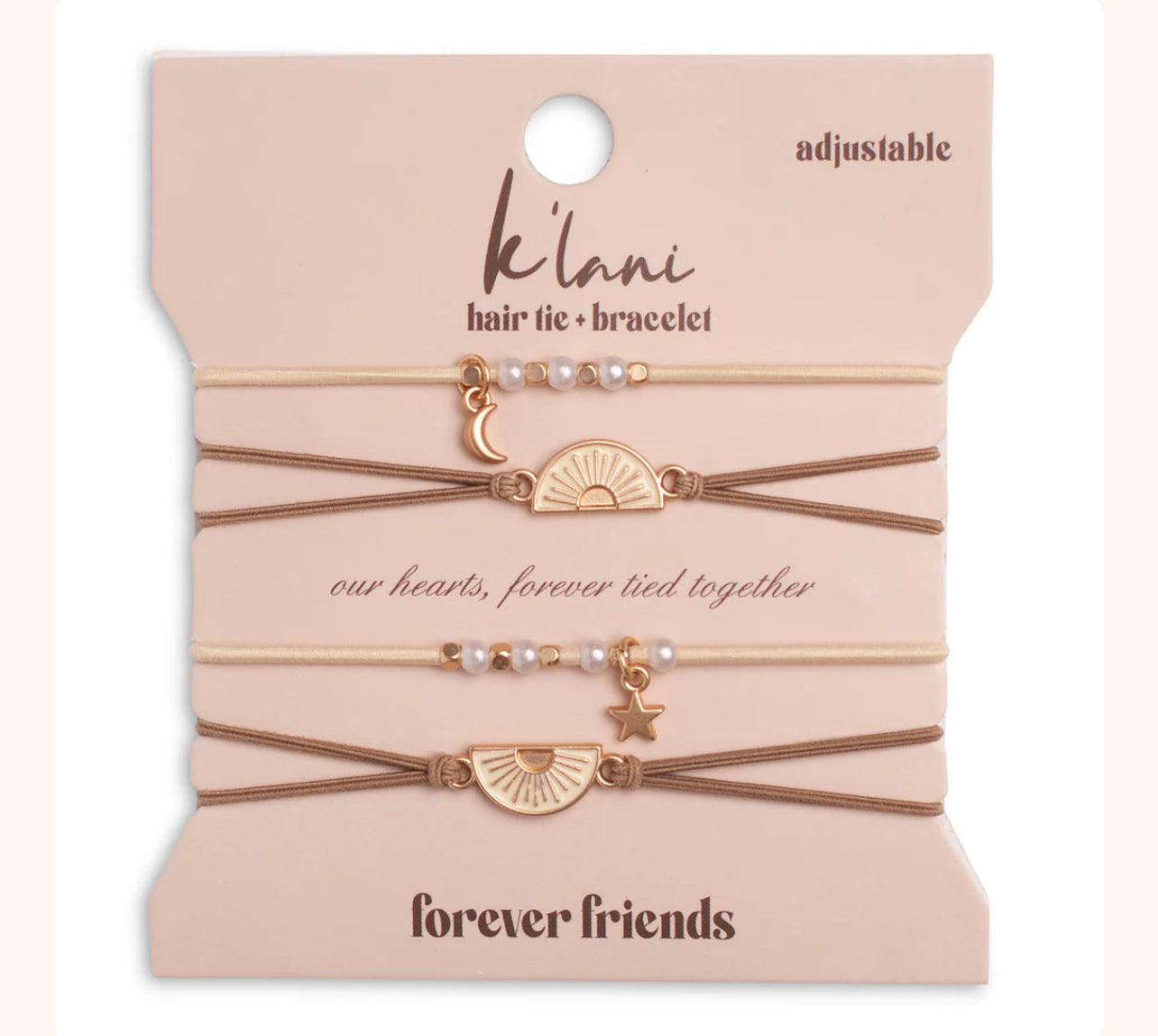 Celebrate the special connection between you and your best friend with our new Forever Friend hair tie bracelet. Each set includes four adjustable-size bracelets, with two for each friend. Featuring a half-sunrise design, these bracelets come together to form a full sunrise, with dainty star and moon charms, symbolizing the light and positivity you bring into each other's lives. Our Forever Friend Set is crafted in neutral colors to complement any style. Whether worn as a bracelet or a hair tie, these are the perfect gift to show your love to a forever friend.