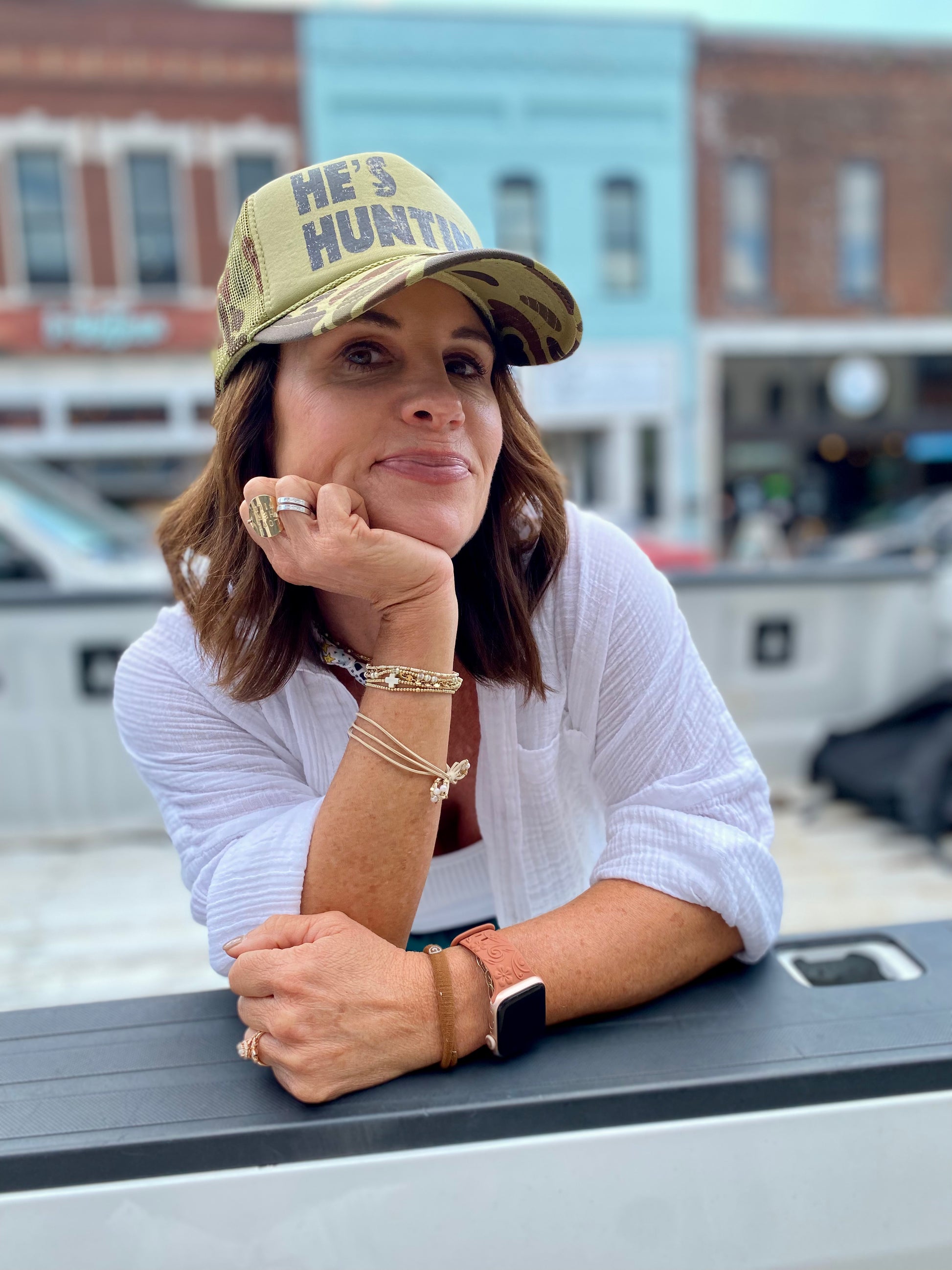 Catch eyes and laughs with the "He's Hunting" camo trucker hat. This playful and quirky hat is perfect for any wife/girlfriend of a hunting enthusiast.
