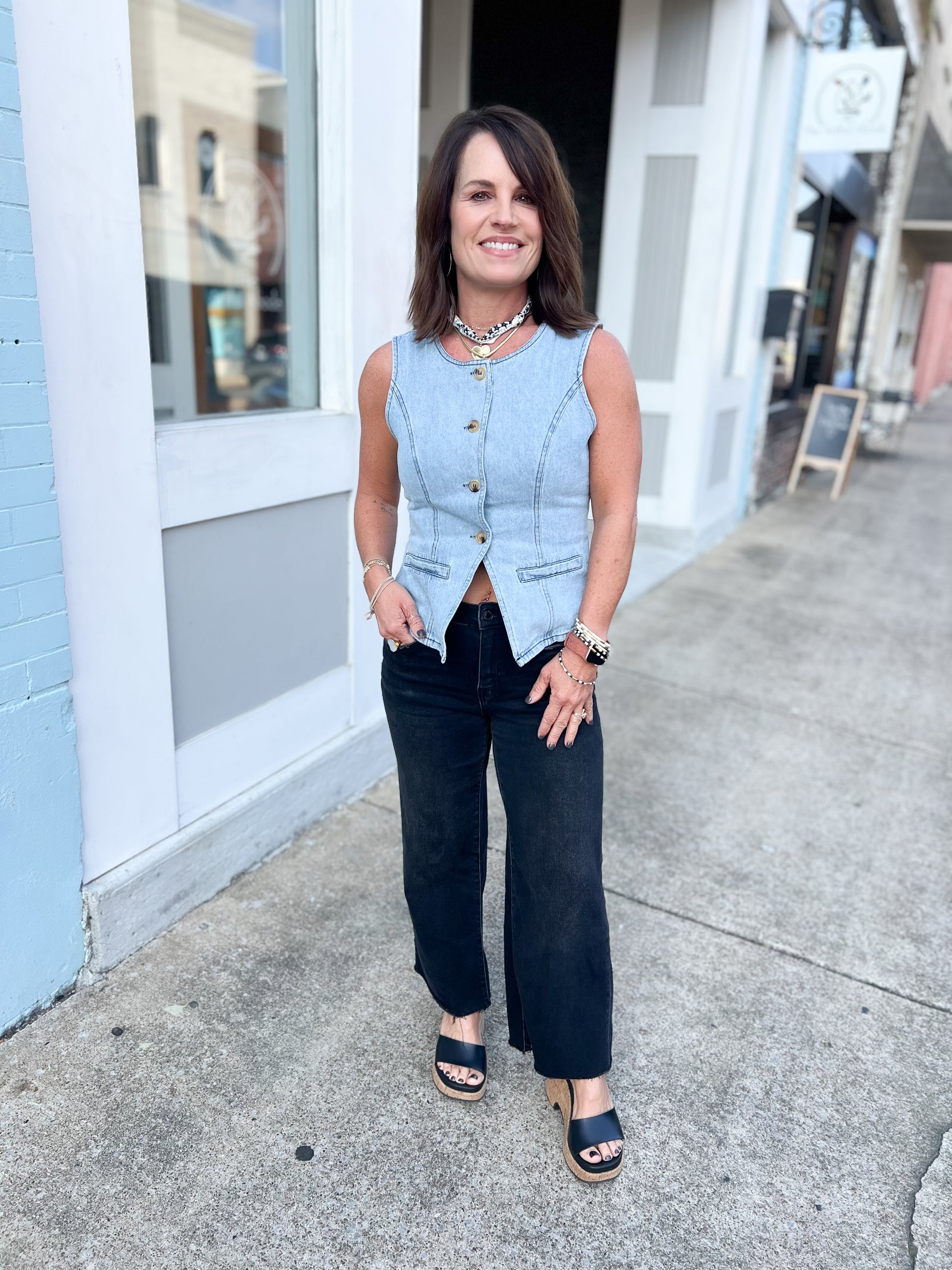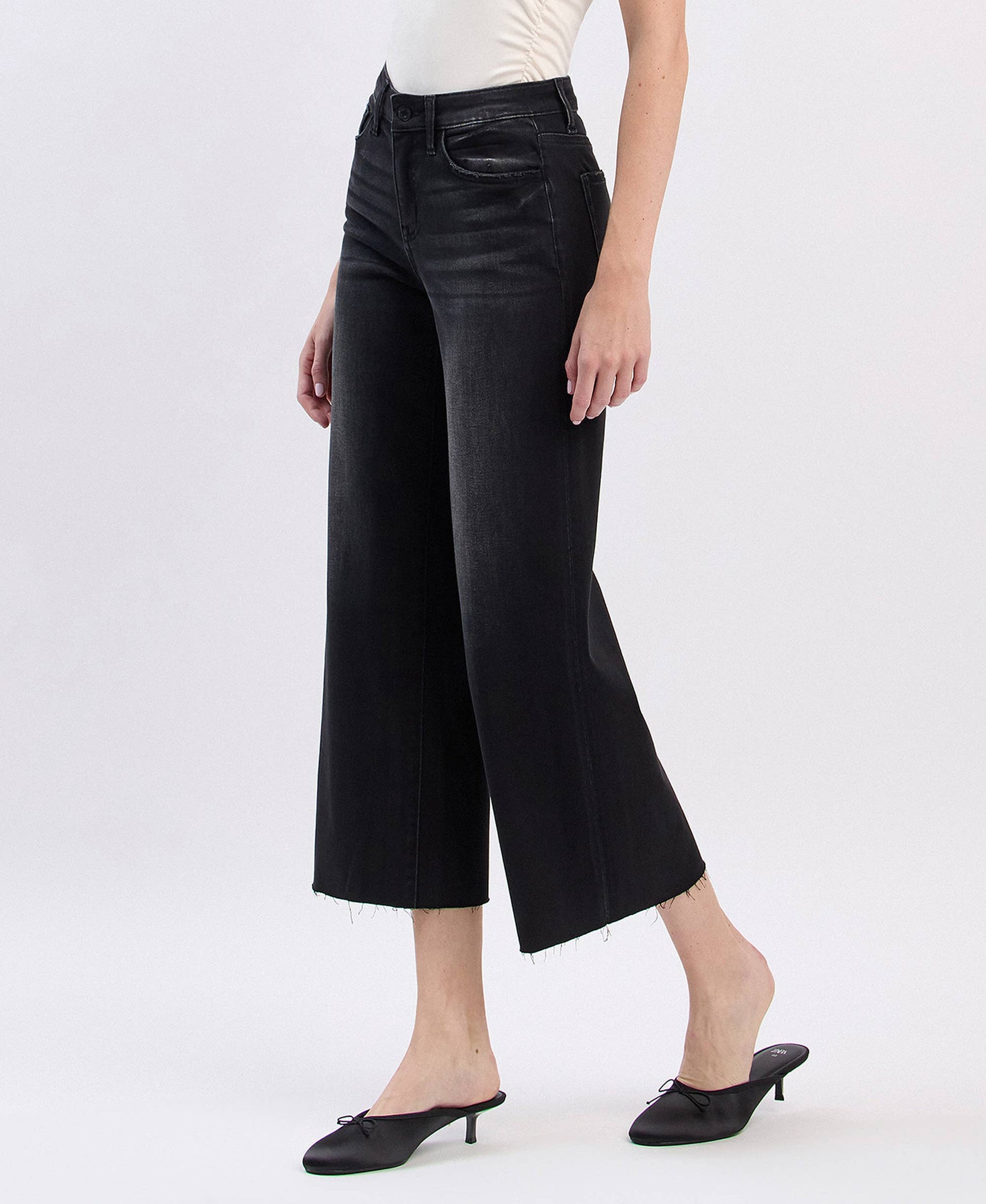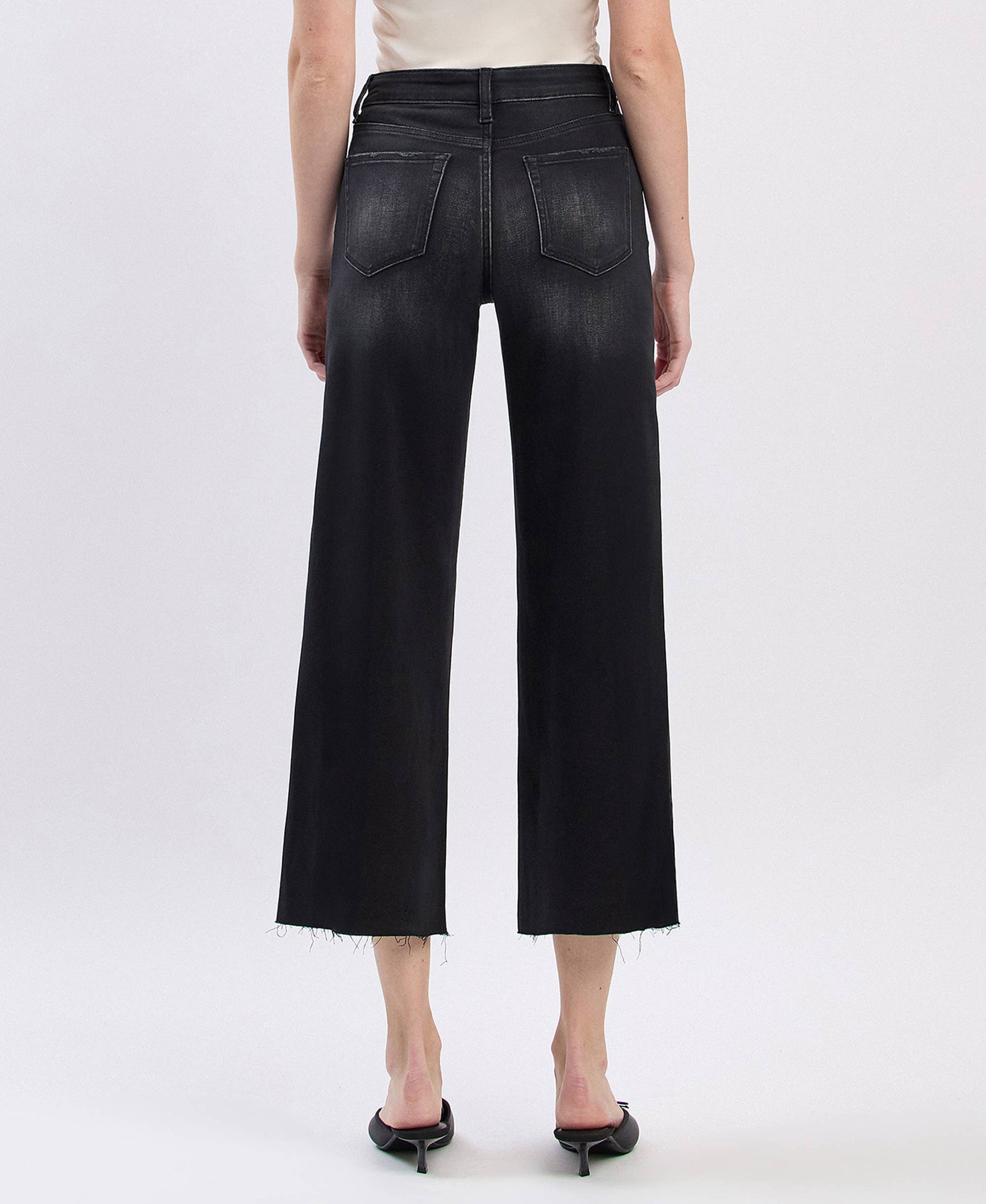 COMFORT STRETCH DENIM, HIGH RISE WAIST, CLEAN CUT RAW HEM, CROPPED LENGTH, SLIM WIDE JEANS F. RISE: 10" / INSEAM: 26 1/2" / LEG OPENING: 21" MODEL IS 5'10" WEARING A SIZE 26