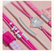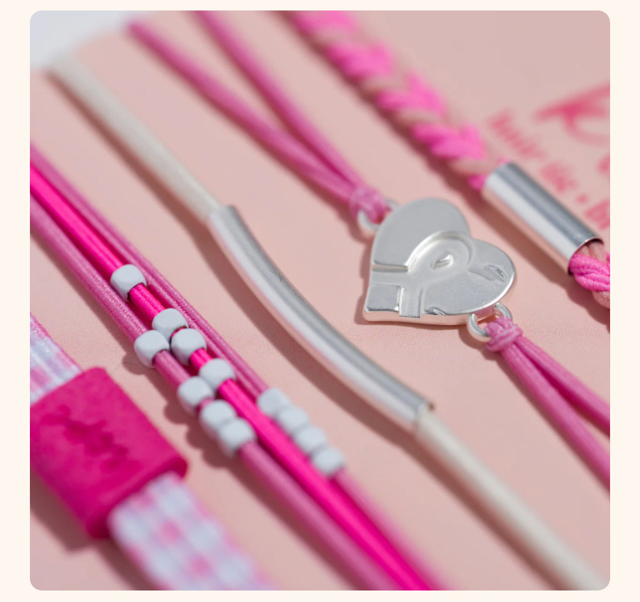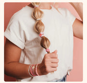 Our Hope set includes five hair tie bracelets in comforting pinks.  The silver heart charm has a breast cancer ribbon to show our support to the cause.  A portion of the proceeds will be donated to the Susan G. Komen foundation.