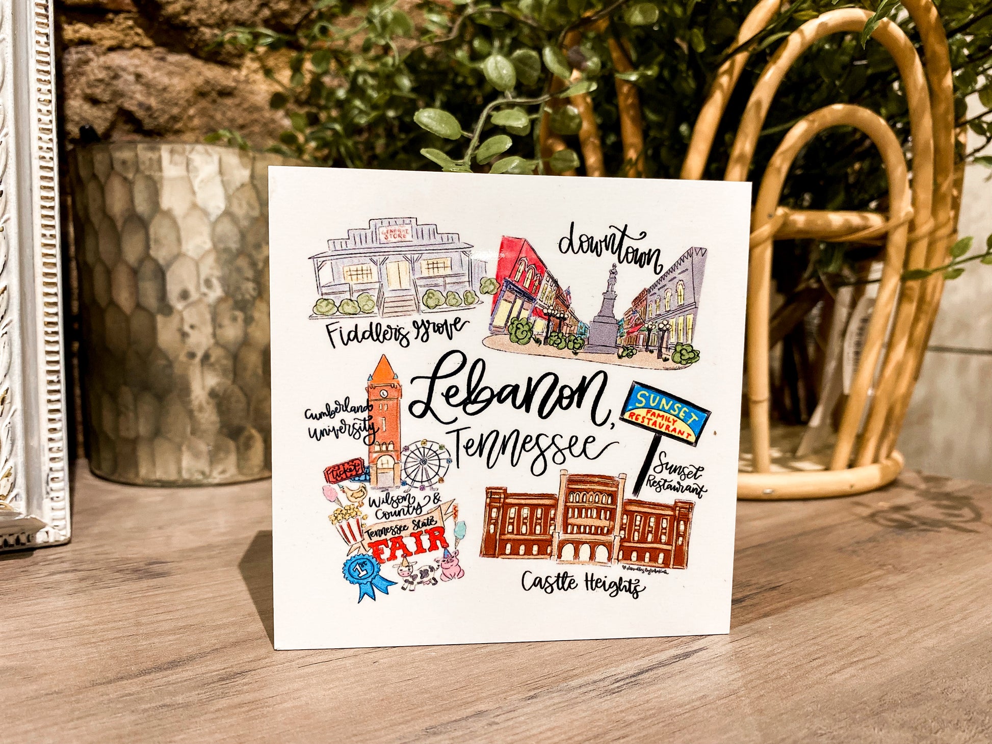Bring a piece of Lebanon, TN into your home with our 4x4 table block. Featuring iconic spots like Fiddlers Grove, the Wilson County Fair, Sunset Restaurant and Cumberland University, it's a charming reminder of our hometown. Perfect for any Lebanon lover, it's a cute and unique addition to any space!