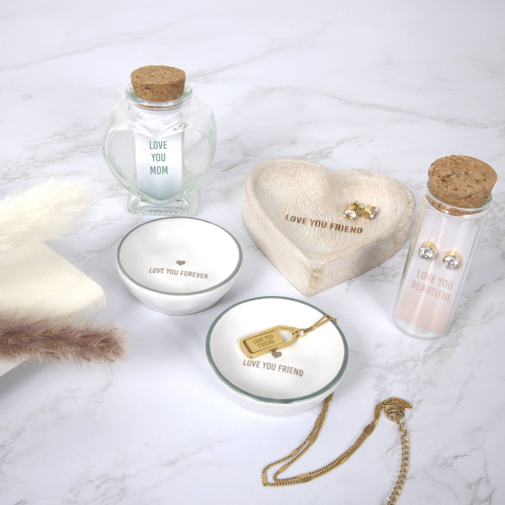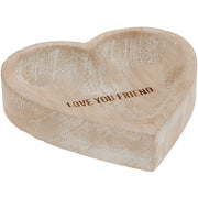 This paulownia wood heart-shaped keepsake dish measures 4" wide x 4" long x .75" tall. The hardwood makes the product very lightweight but solid and resistant. The scooped-out center is perfect for holding jewelry - necklaces, bracelets, earrings, rings, coins, small desk items such as thumbtacks, paperclips, and other catchall items. The "Love You Friend" sentiment is laser engraved into the middle center of the dish's interior. The beachy finish is neutral to fit into any home. Wipe clean with a damp cloth. It is packaged in a die-cut box. For decorative purposes only - Do not use for food. A wonderful present for your best friend who means the world to you. Give the gift of a cherished memory for them to reflect on how truly valued and loved they are. With a bond that can't be broken, this unique gift from BFF to bestie will bring the biggest smile to their face. Fantastic for Galentine's Day.