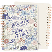 A double-sided spiral notebook from our Faith Collection displaying beautiful botanicals surrounding a faith inspired sentiment that reads "For I Know The Plans I Have For You Declares The Lord - Plans To Prosper You & Not To Harm You - Plans To Give You Hope & A Future." Faith design is replicated from original hand illustrated artwork. Back cover features a coordinating flowers design. Our Plans To Prosper You spiral notebook includes 120 lined pages. A faith-themed accessory that is also great for gifting.