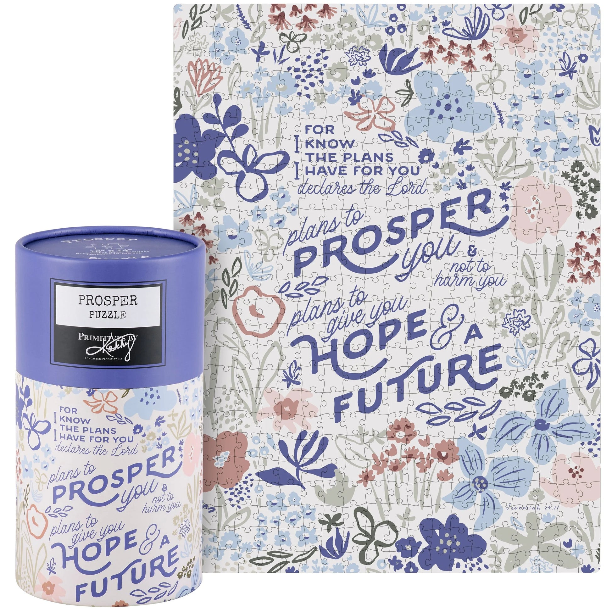 A 500 piece puzzle from our Faith Collection displaying beautiful botanicals with a faith inspired sentiment that reads "For I Know The Plans I Have For You Declares The Lord - Plans To Prosper You & Not To Harm You - Plans To Give You Hope & A Future." Faith design is replicated from original hand illustrated artwork. Puzzle pieces are packaged in a resealable plastic bag and enclosed in a cylindrical box with the design displayed around outside and a descriptive "Prosper Puzzle" sentiment on lid. Our Plans To Prosper You 500 piece puzzle includes a printout of full puzzle image for reference. Contains small parts; this is not a toy. An inspirational puzzle great for gifting.