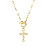 Delicate link chain with a shimmering CZ embellished cross, sporting a glam front toggle closure.