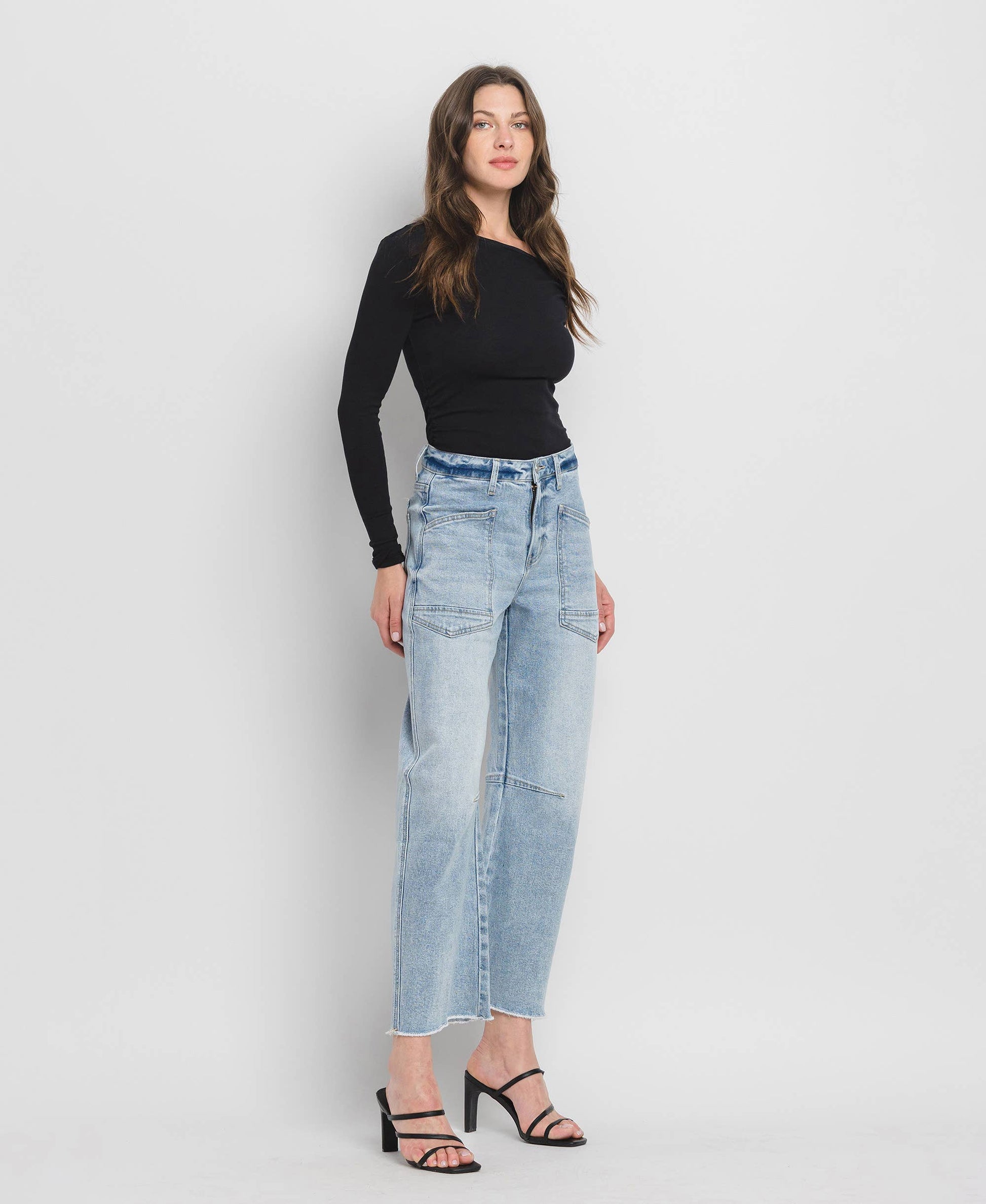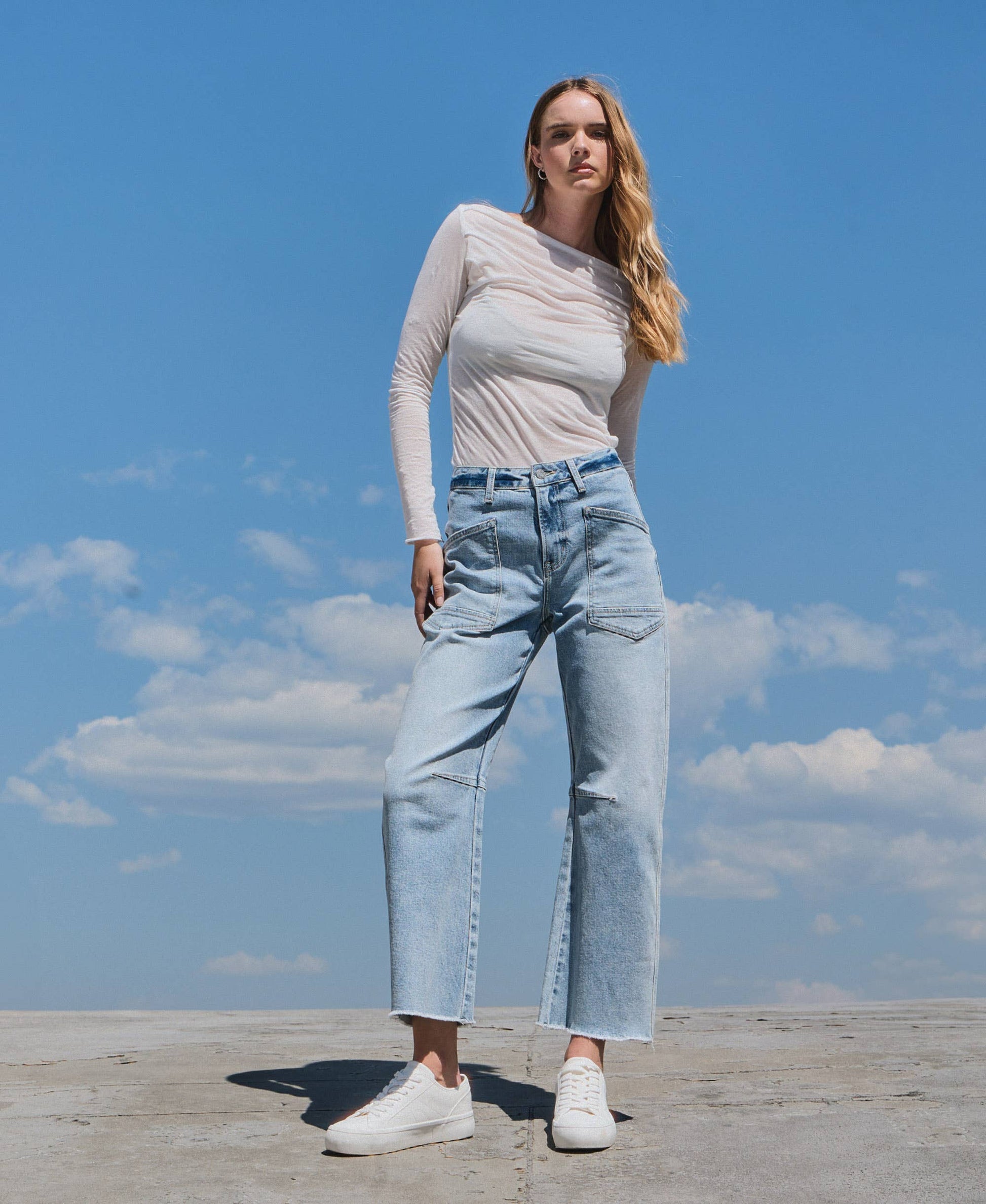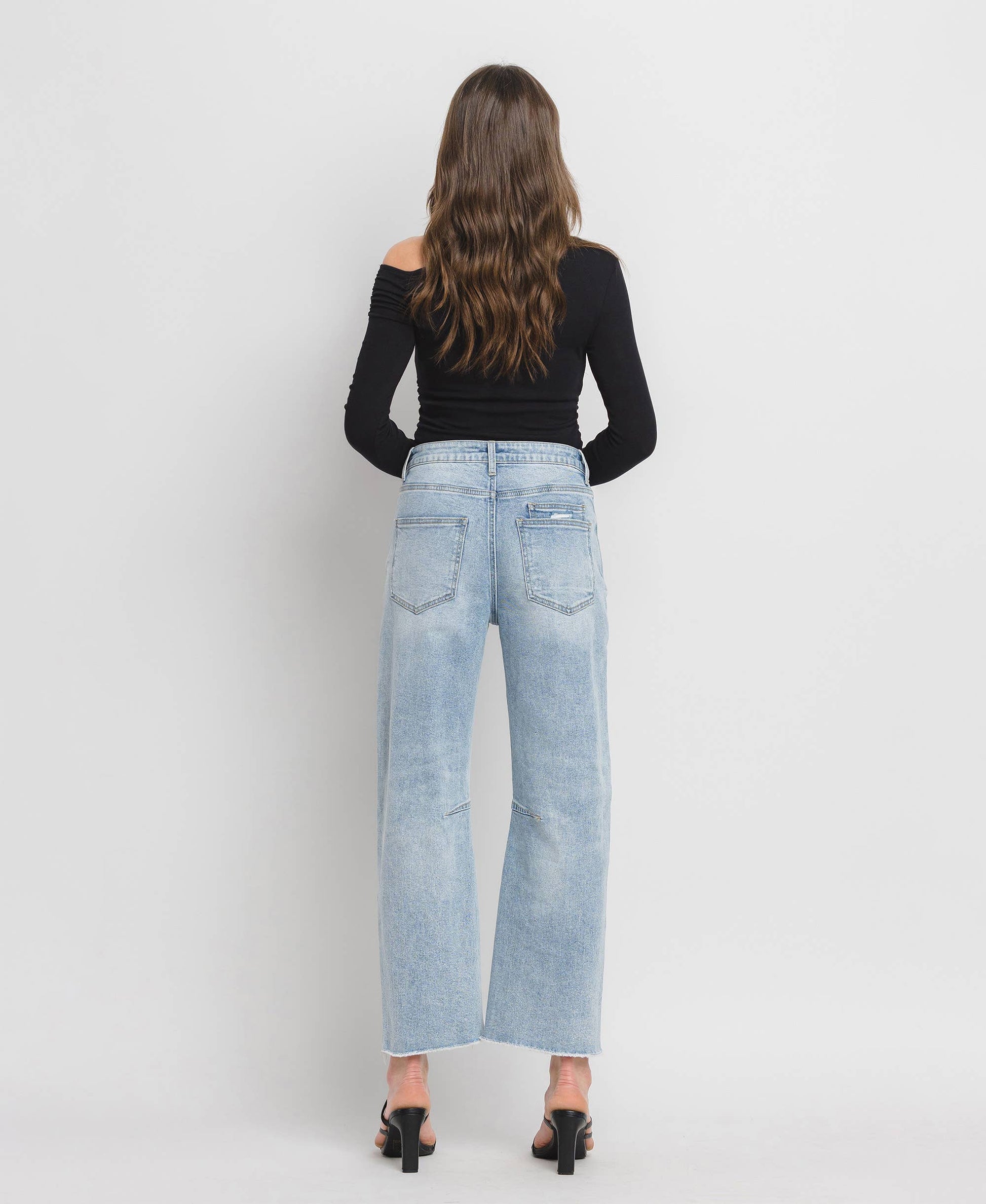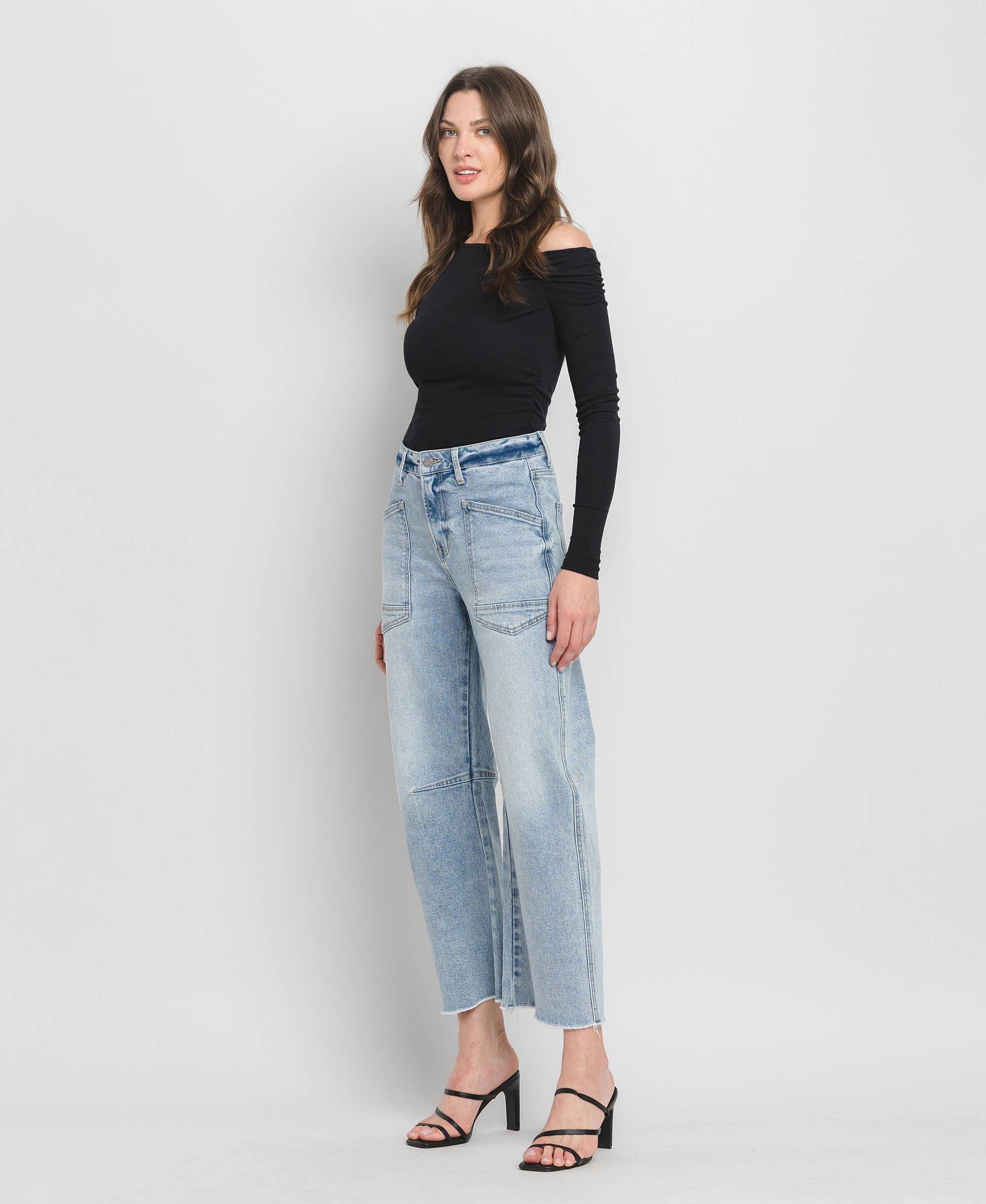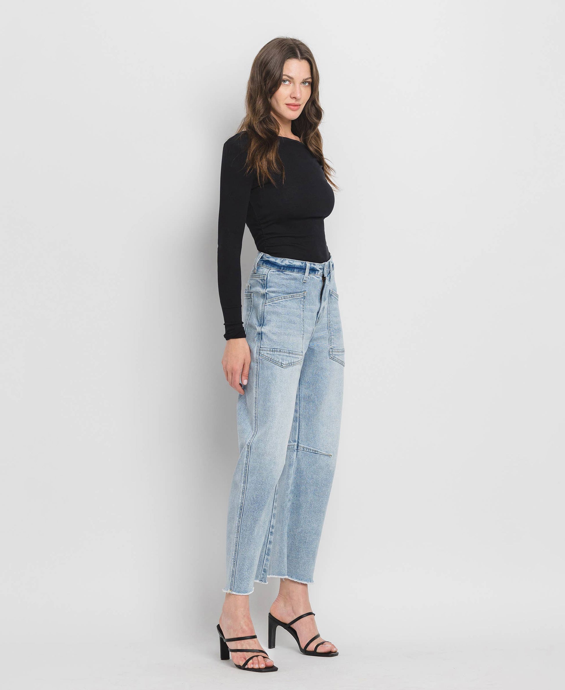 Super high rise barrel jeans. Comfort stretch denim, super high rise waist, pocket detail, raw hem, cropped length.