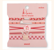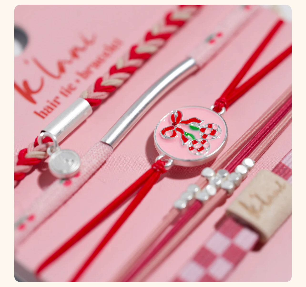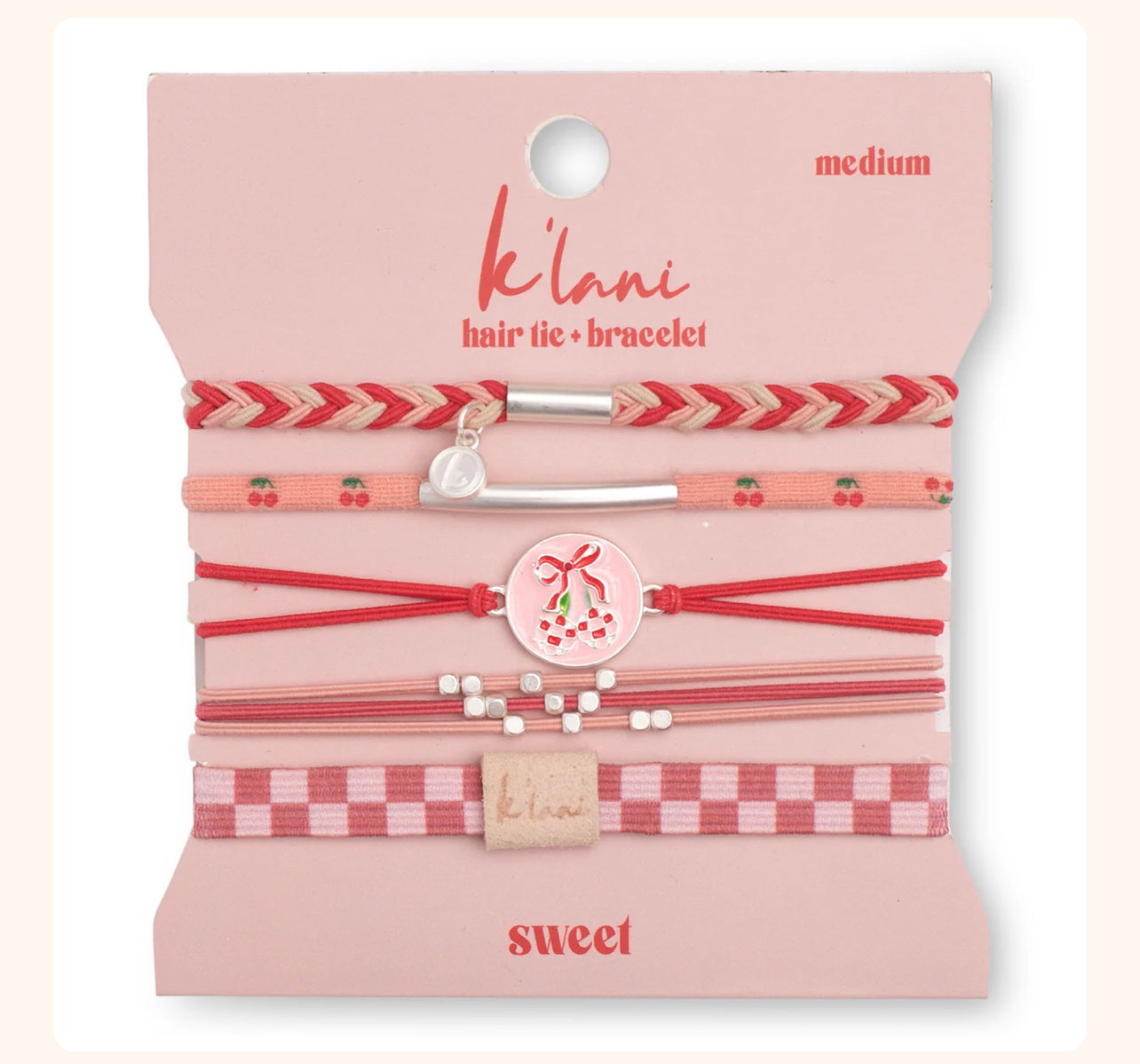 Our Sweet set includes 5 hair tie bracelets in fun coral, reds, and pinks. A touch of sweetness comes with the cherry charm and cute print. This set will surely remind us of fun and sweet summer days.